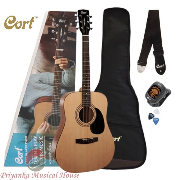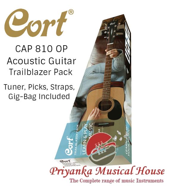 The Trailblazer acoustic guitar starter pack(CAP810) offers a great all-in-one solution to get started playing at a very affordable price. It includes Cort’s best-selling, full-sized AD810 dreadnought acoustic guitar, a gig bag, comfortable shoulder strap, picks, and an electronic guitar tuner to get you playing right away. Whether you're looking for a great gift for your budding musician or an affordable way to get started yourself, the Cort Trailblazer Pack is the right choice. CAP810 Trailblazer Pack Open Pore Features Specifications Images Video Features AD810 Included in the package is Cort’s best-selling AD810 model. AD810 is from our Standard Series that offers solid performance for beginners and hobbyists alike with robust build and sound quality that is suitable for many playing situations. AD810 features Spruce top and Mahogany back and sides for traditional balanced sound, while the full-sized dreadnought body offers full body output and plenty of projection. Spruce Top Spruce provides an ideal balance between strength and flexibility, hence its overwhelming popularity as the wood of choice for tops of acoustic guitars. Spruce’s versatile sonic character makes it ideal for a variety of musical genres and playing styles. Mahogany Back & Sides Bright yet natural with a strong and warm midrange, the beloved mahogany wood has been a standard for back and sides on premium acoustics for many decades. Open Pore Finish Not only does the open pore finish enhance the resonance of the woods but it also reduces the weight of the guitar for improved playability. Coated Strings High-quality coating on the strings resist humidity, dirt and sweat for long string life and improved playability. Specially outfitted on this model. Dovetail Neck Joint Strongly joined with meticulous workmanship by experienced craftsmen, the dovetail joint transfers the body’s vibration and resonance to the neck with no loss of energy and with plenty of detail. Cort E310C Tuner This clip-on electronic tuner provides quick and accurate tuning with easy-to-read backlit display, and its compact size and light weight makes it more adequate for clipping on to a headstock. Picks Cort medium thickness picks are included. Straps Comfortable shoulder strap is included. Gig-Bag Great for carrying your guitar around, the gig bag also helps prevent unwanted dust from contaminating your guitar while it is stored. Features Specifications Images Video Specifications CONSTRUCTION Dovetail Neck Joint BODY Dreadnought NUT WIDTH 43㎜ (1 11/16") TOP Spruce BACK & SIDES African Mahogany(Okoume) NECK Mahogany(Palaquium) FRETBOARD Merbau FRETS 20 SCALE 643㎜ (25.3") INLAY Dot TUNERS Die-Cast BRIDGE Merbau STRINGS Coated Strings BRACING Advanced X-Bracing SPECIAL * Tuner, Picks, Straps, Gig-Bag Included