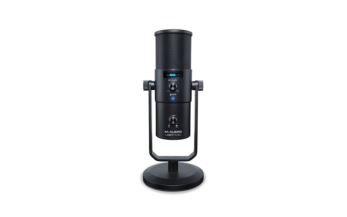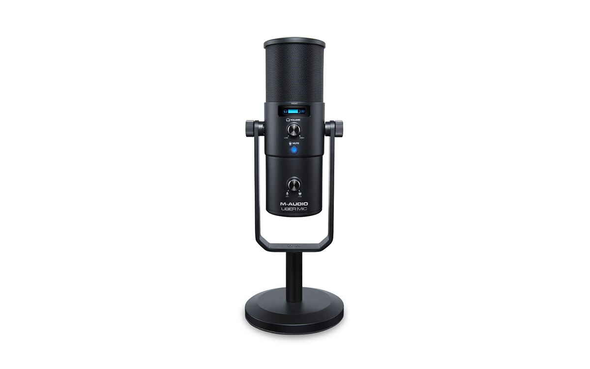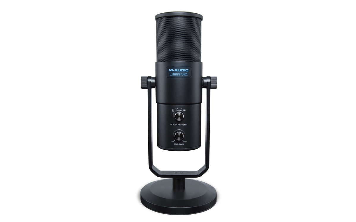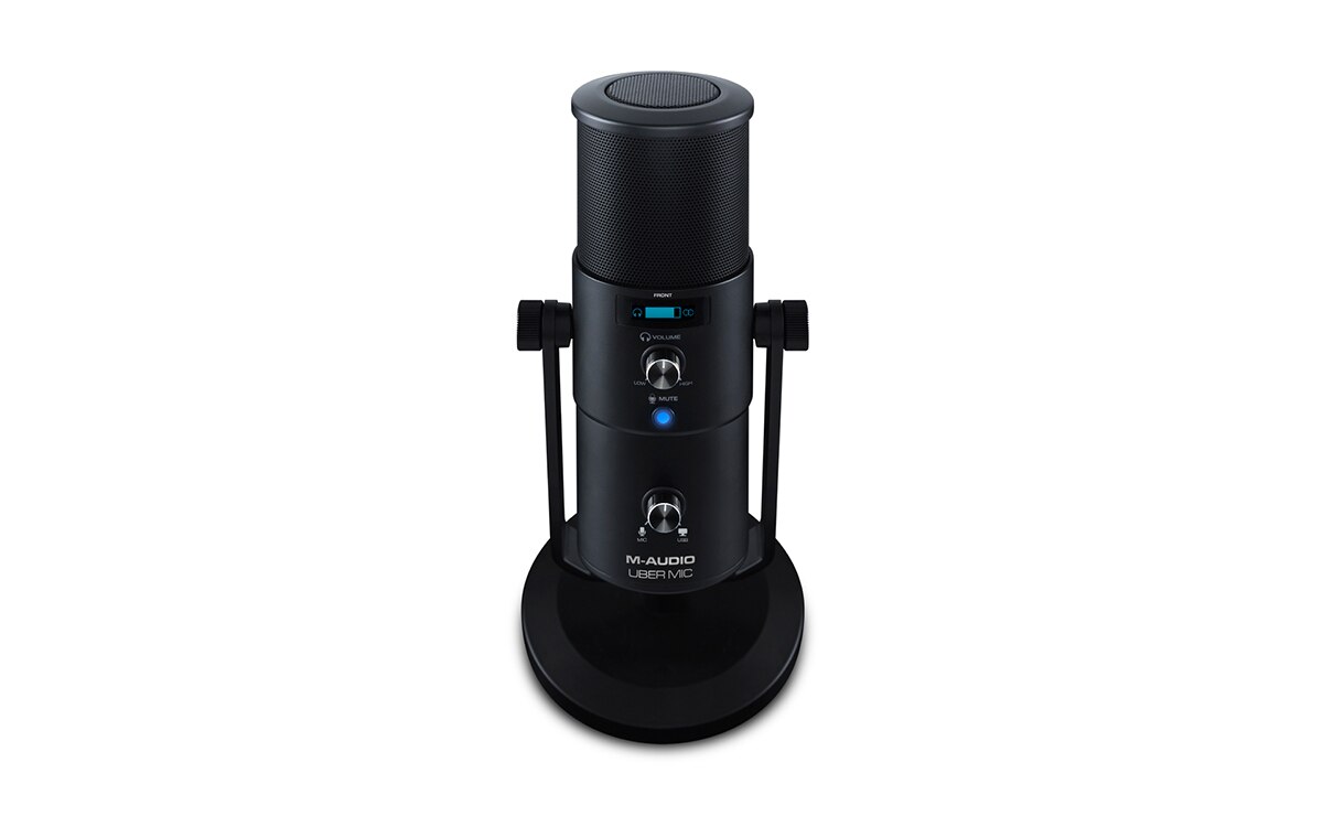 Recording Simplified! Uber Mic is the perfect set-up for all your recording needs—whether it’s recording acoustic instruments & vocals, capturing pristine audio for podcasts & broadcasting, or simply bringing your gaming experience to the next level. Uber Mic does it all – start recording, streaming & broadcasting now! Jack of All Trades Crystal-clear recording demands the right tools for the job. M-Audio’s Uber Mic features a large-diaphragm 3-capsule condenser microphone, perfect for podcasting applications or capturing high-quality audio from vocalists, instruments, percussion and more. With a choice of four polar patterns including cardioid, omnidirectional, figure-8 and single point stereo, Uber Mic is primed for virtually any recording scenario: • Cardioid – a directional pattern, perfect for capturing singular sound sources while eliminating unwanted room reflections and background noise • Omnidirectional – equal output/sensitivity at all angles captures your sound sources from all directions, perfect for adding some ambience to your recordings or capturing a group of sound sources • Figure 8 - equal output/sensitivity on two sides of the microphone, ideal for capturing two independent sound sources simultaneously • Stereo – picks up from the left and right side of the microphone, producing a true stereo image Features - 1. Easy, intuitive operation for any application 2. Wide-range 30–20,000Hz frequency response delivers detailed, natural sound 3. 3-capsule condenser microphone element, including single-point stereo 4. 4 selectable polar patterns to customize your ideal recording 5. Polar patterns: cardioid, figure-8, omnidirectional, and stereo 6. 1/8” headphone jack and internal headphone amplifier 7. USB/direct mixing control with mic volume control enables zero-latency recording and monitoring 8. Microphone mute control ensures privacy 9. LCD display shows polar pattern and currently selected control level 10. Studio-quality recording and playback for accurate reproduction 11. Convenient desktop mounting with threaded insert for optional stand-mounting 12. Integrated stand fits easily into any setup 13. iOS compatibility using the Apple iPad Camera Connection Kit (sold separately) Specifications - Microphone: Type: 3-capsule condenser USB microphone Capsule Size: 16mm Polar Patterns: Figure 8, cardioid, omni, and stereo Frequency Response: 30 Hz - 20 KHz Sensitivity: -45 dB (0 dB = 1V/Pa @ 1 kHz) SNR: 110 dB Maximum SPL: 120 dB (THD <1%, 1 kHz) Headphone Output: Impedance: 10 Ω Output Power: 30 mW (@48Ω) THD: 0/03% Frequency Response: 20 Hz - 20 KHz SNR: 110 dB General: Connectors: (1) 1/8” (3.5 mm) TRS/stereo headphone output (1) mini-USB port (1) 5/8”-27 mounting point Power: via mini-USB Dimensions: 4.5” x 10.75” / 11.4 x 27.3 cm (diameter x height; with integrated stand) Weight: 4.0 lb. / 1.8 kg (microphone & integrated stand) 1.5 lb. 0.7 kg (microphone only) 2.1 lb. / 1.0 kg (integrated stand only)