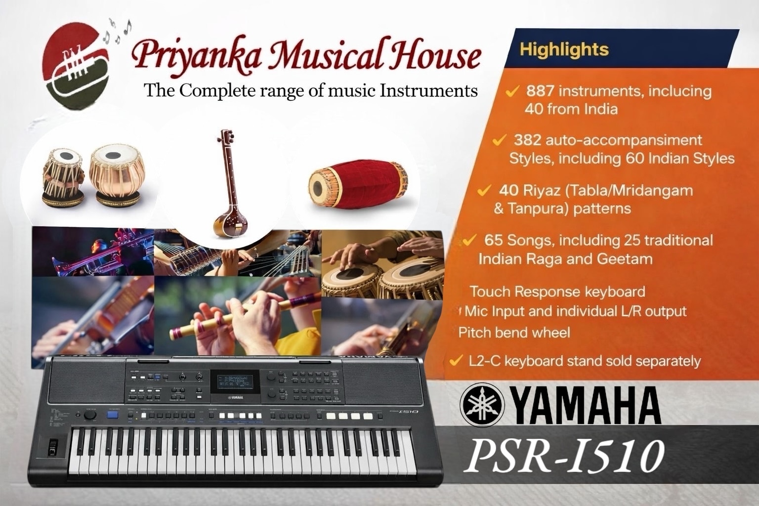 Highlights 887 instruments, including 40 from India 382 auto-accompaniment Styles, including 60 Indian Styles 40 Riyaz (Tabla/Mridangam & Tanpura) patterns 65 Songs, including 25 traditional Indian Raga and Geetam Touch Response keyboard Mic Input and individual L/R output Pitch bend wheel L2-C keyboard stand sold separately